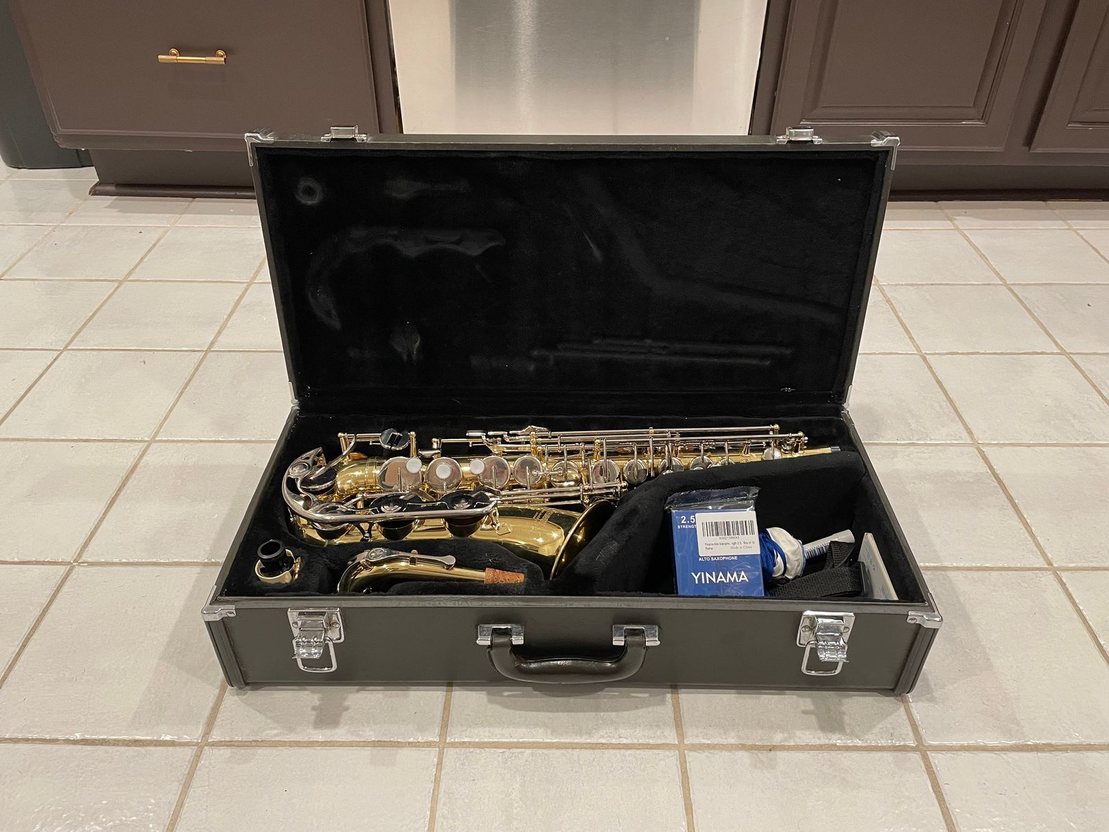 It includes the original Yamaha case (which is holding up well), plus a mouthpiece and a factory-sealed pack of 10 fresh reeds so you’re ready to jump right in when it arrives.