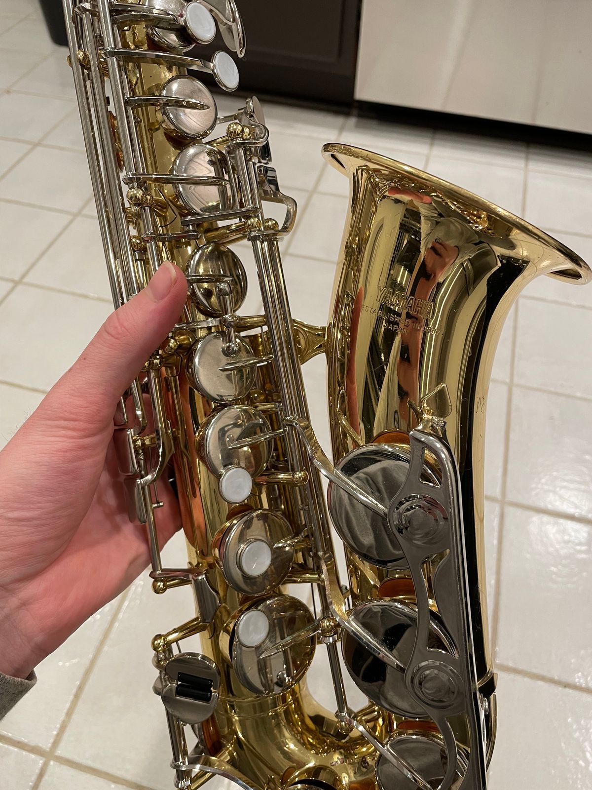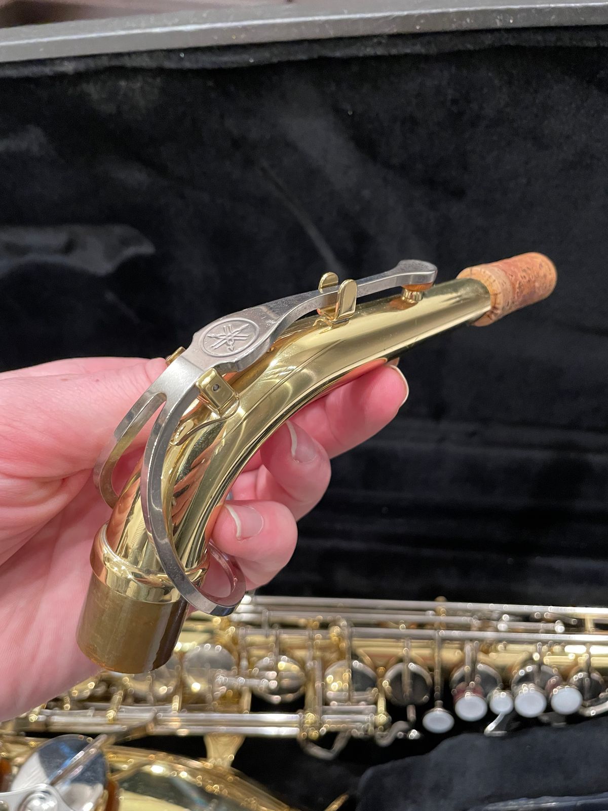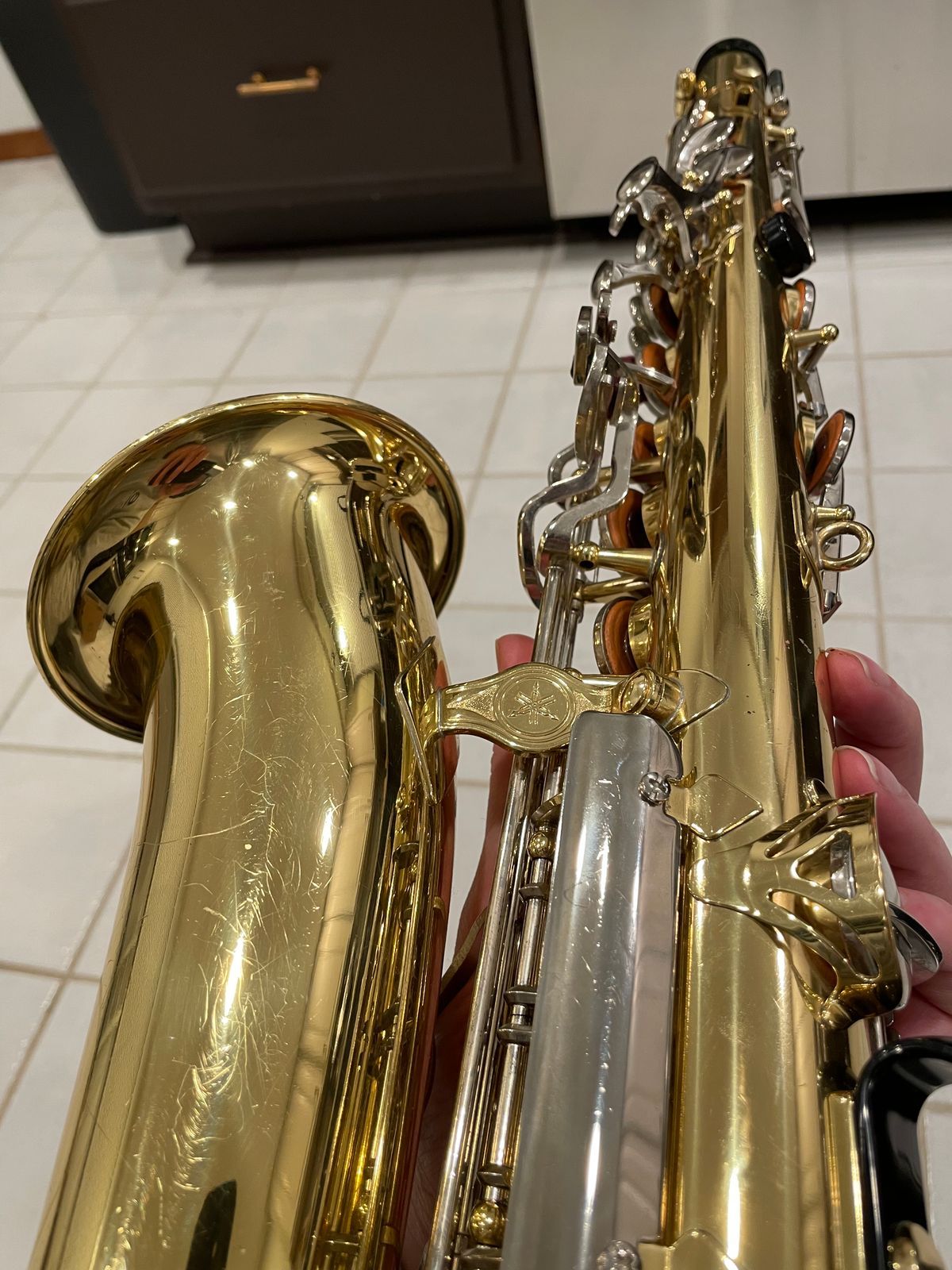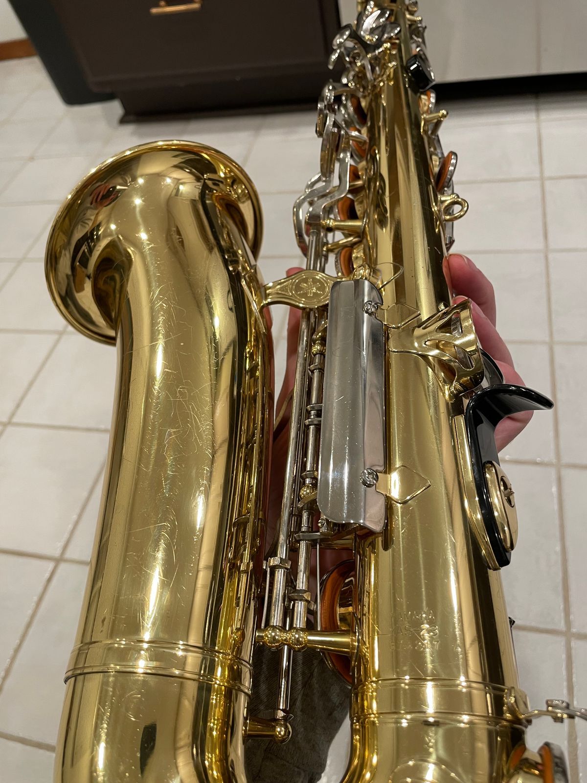 The horn’s in really solid shape for something used—there are the usual light scratches and scuffs from normal playing on the body and keys, but no dents, no big dings, nothing major at all. It still looks good and has that nice shiny Yamaha lacquer finish showing through.