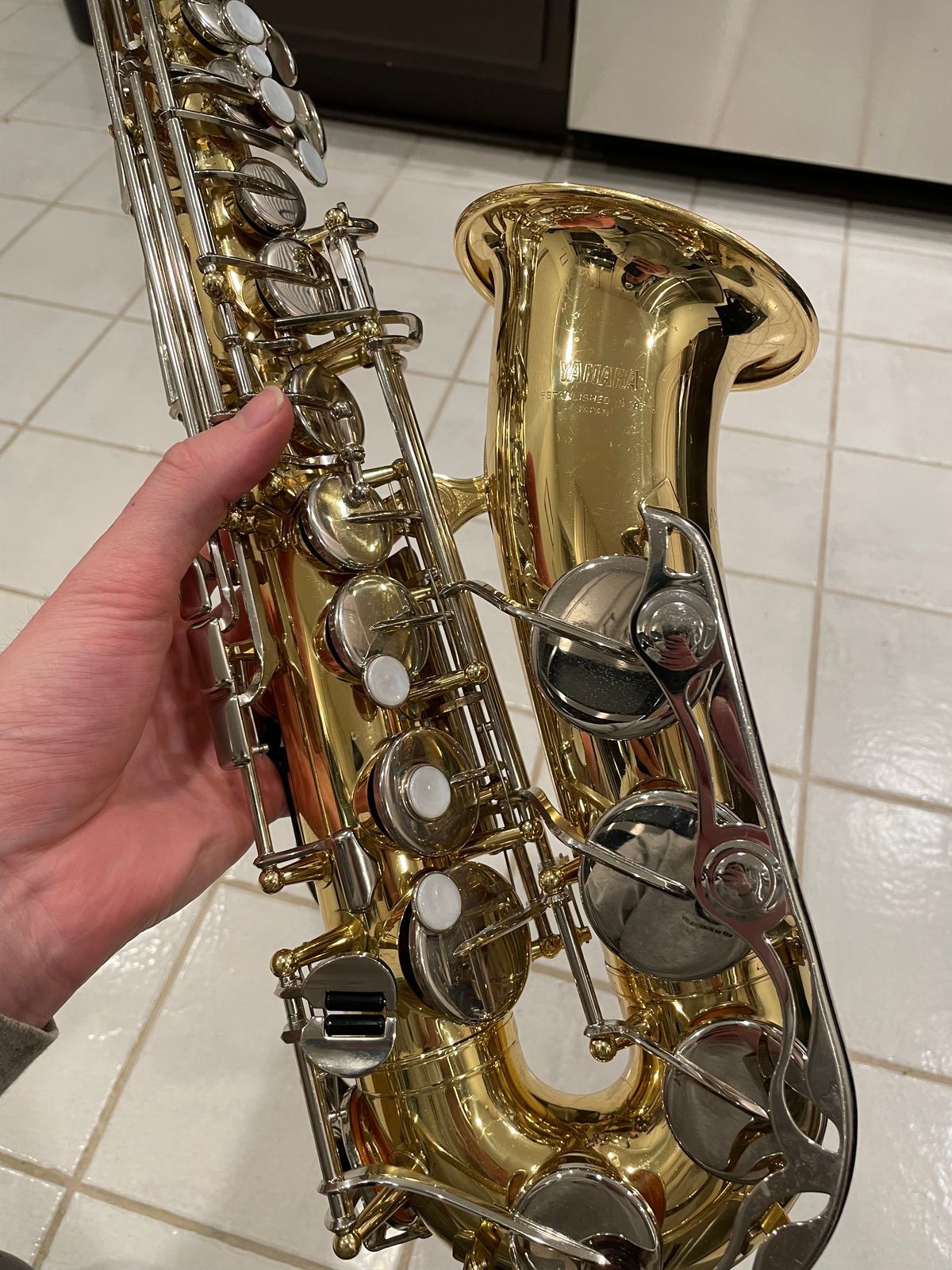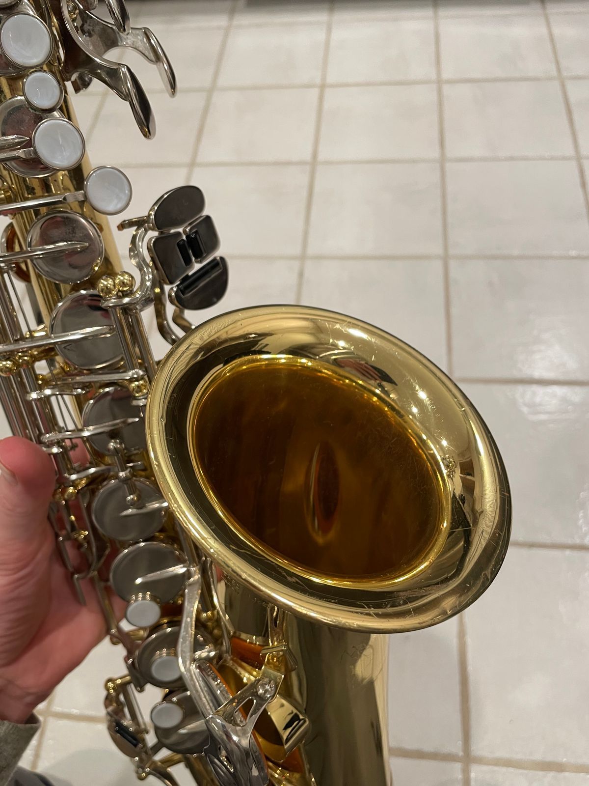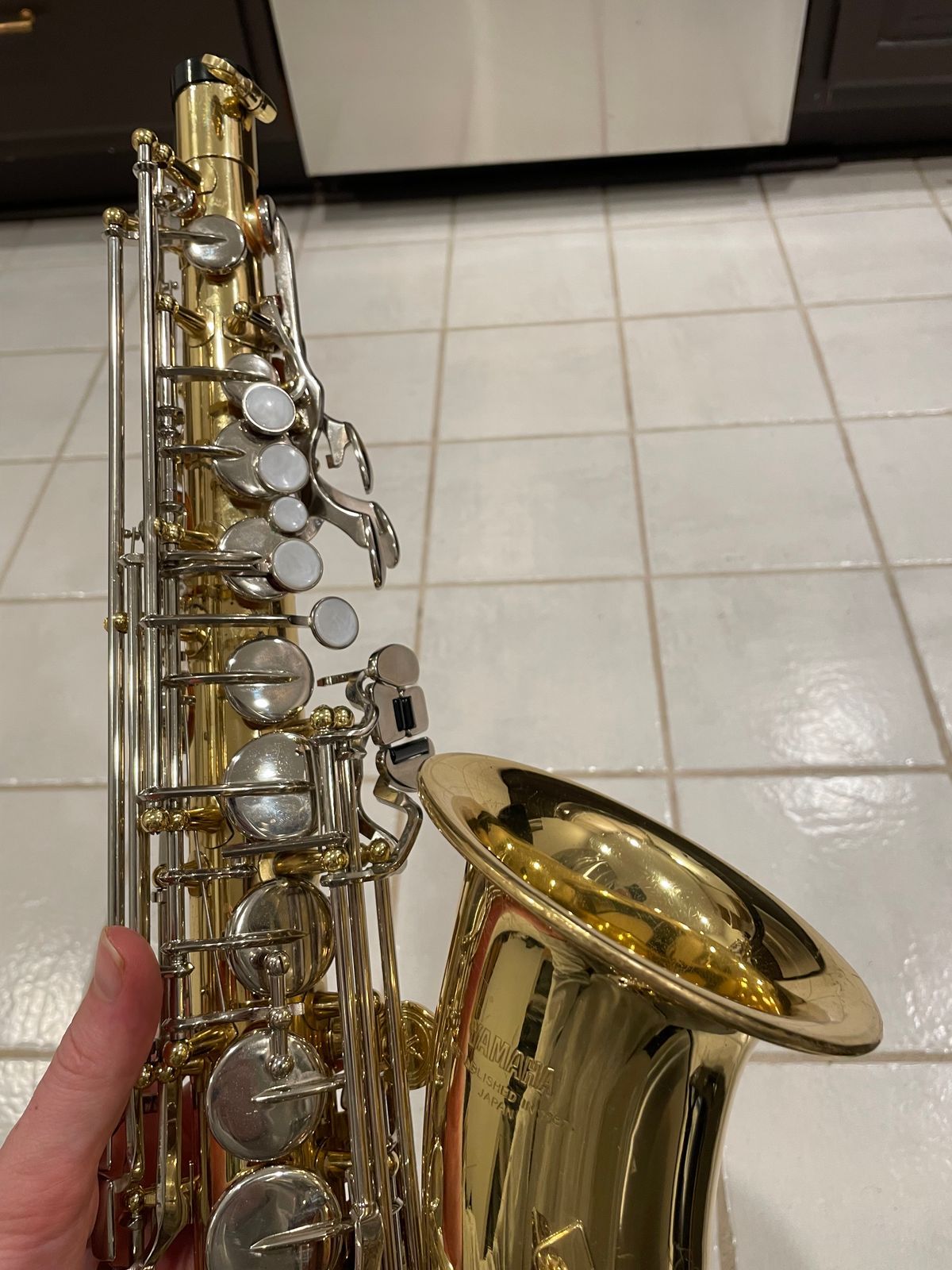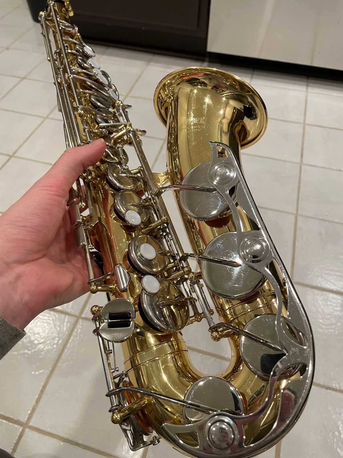 The horn’s in really solid shape for something used—there are the usual light scratches and scuffs from normal playing on the body and keys, but no dents, no big dings, nothing major at all. It still looks good and has that nice shiny Yamaha lacquer finish showing through.