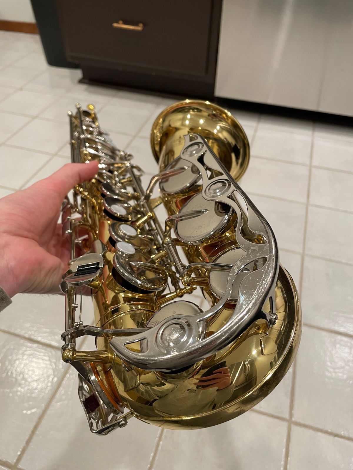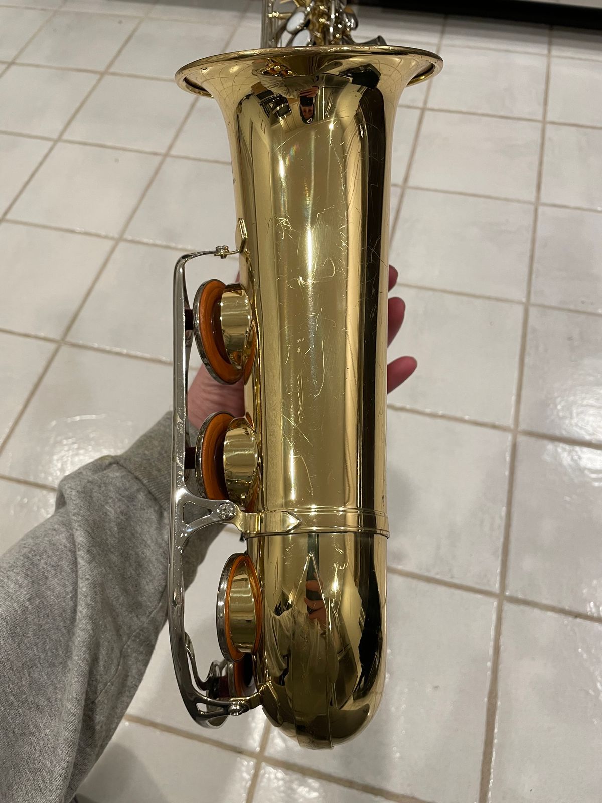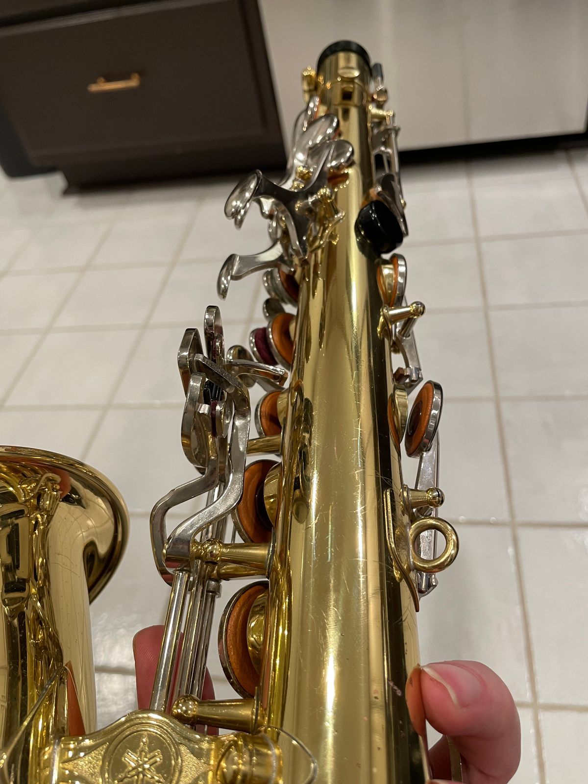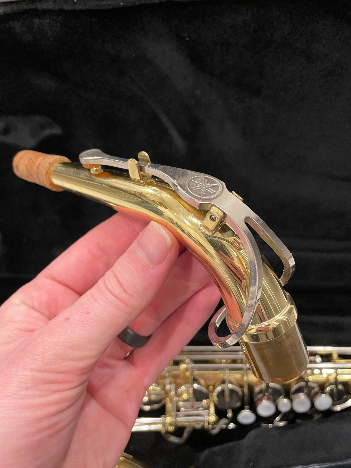 The horn’s in really solid shape for something used—there are the usual light scratches and scuffs from normal playing on the body and keys, but no dents, no big dings, nothing major at all. It still looks good and has that nice shiny Yamaha lacquer finish showing through.